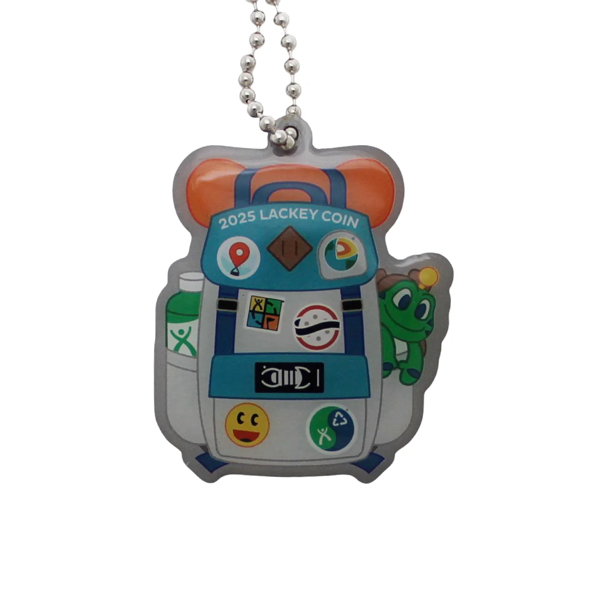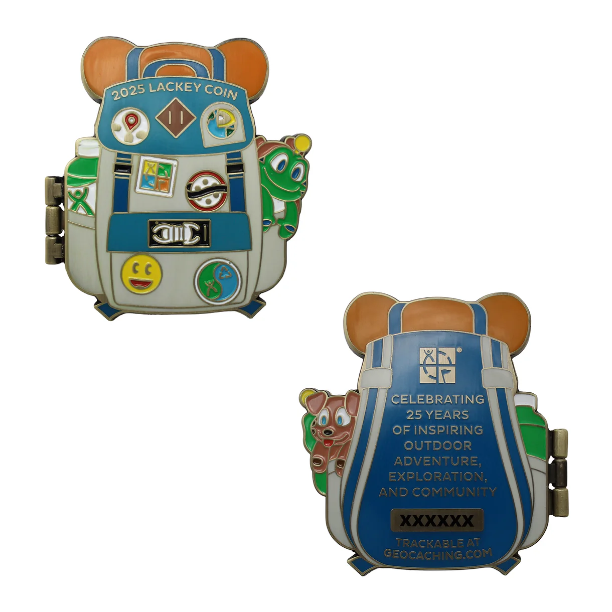 Vuoden 2025 Lackey-kolikon inspiraationa on seikkailun henki! Reppuaiheinen kolikko avautuu paljastaen Geocaching HQ:n Lackeyt pikselikuvakkeina – he ovat geokätköilijöitä palvelevan maailmanlaajuisen yhteisön tukijoukot.