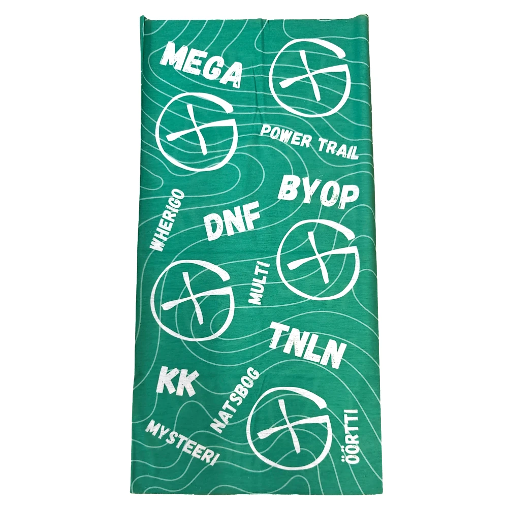• Design: pirteän vihreässä kuosissa on maastokartan korkeuskäyräkuviointi ja tuttuja lyhenteitä ja sanoja geokätköilyyn liittyen.