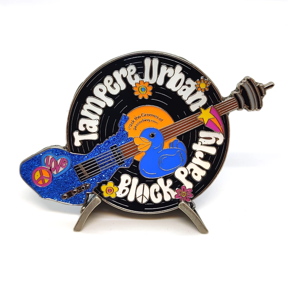 Geokolikko on saanut inspiraationsa tapahtuman teemasta, joka on musiikki ja hauskanpito. Etupuolta koristaa vinyylilevy, jonka edestä kulkee “Suomi-kitara”, jonka kaulana on Tampereen maamerkki Näsinneula. Vinyyliä kiertää teksti Tampere Urban Block Party. Kumiankka viittaa tietenkin tapahtumapaikkaan Sorsapuistoon. Geokolikossa on nähtävissä hippimäisiä elementtejä kuten kukkasia ja rauhanmerkkejä. Takapuolella geokolikkoa koristaa Geocaching.com:n Block Party -logo sekä juhliva yleisö. Rock Lives On!